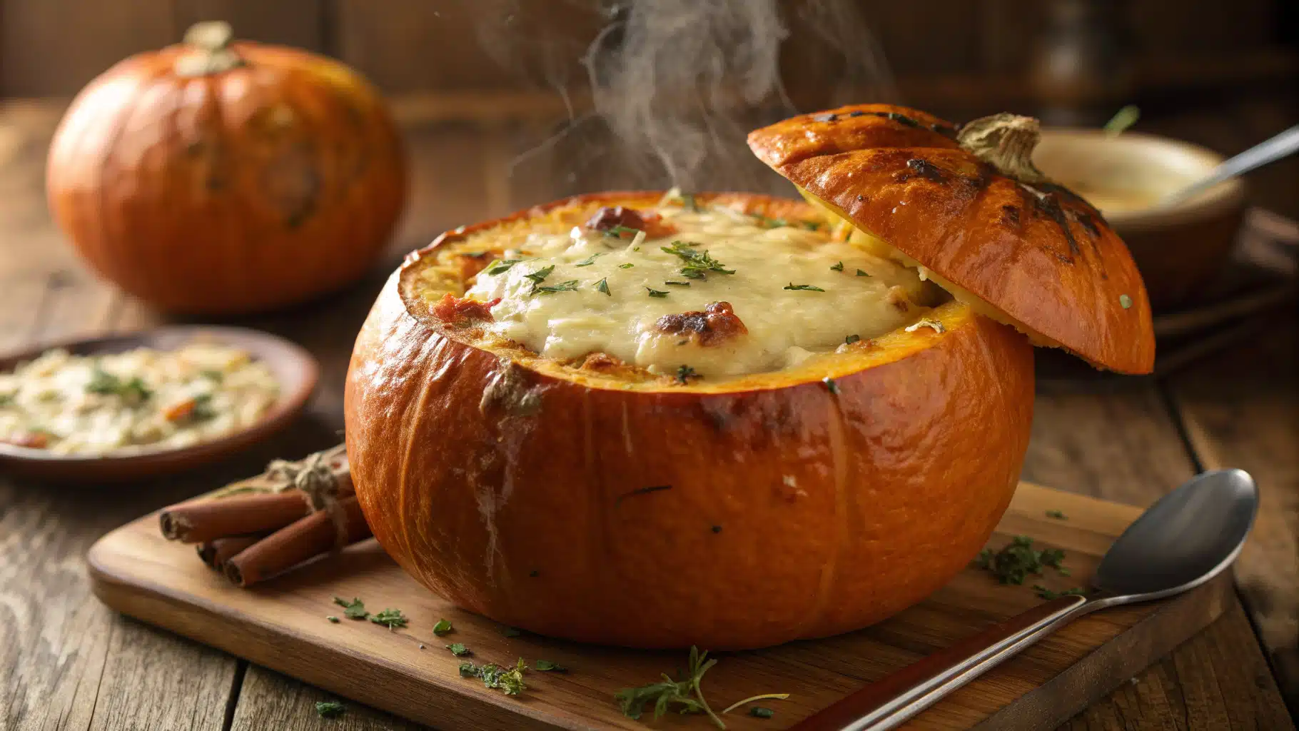 Après l’avoir délicatement coupé et vidé sans abîmer la coque, utilisez la chair extraite dans la farce ou pour une soupe rustique en complément. Plusieurs personnes oublient cette astuce — pourtant, elle valorise tout le légume.